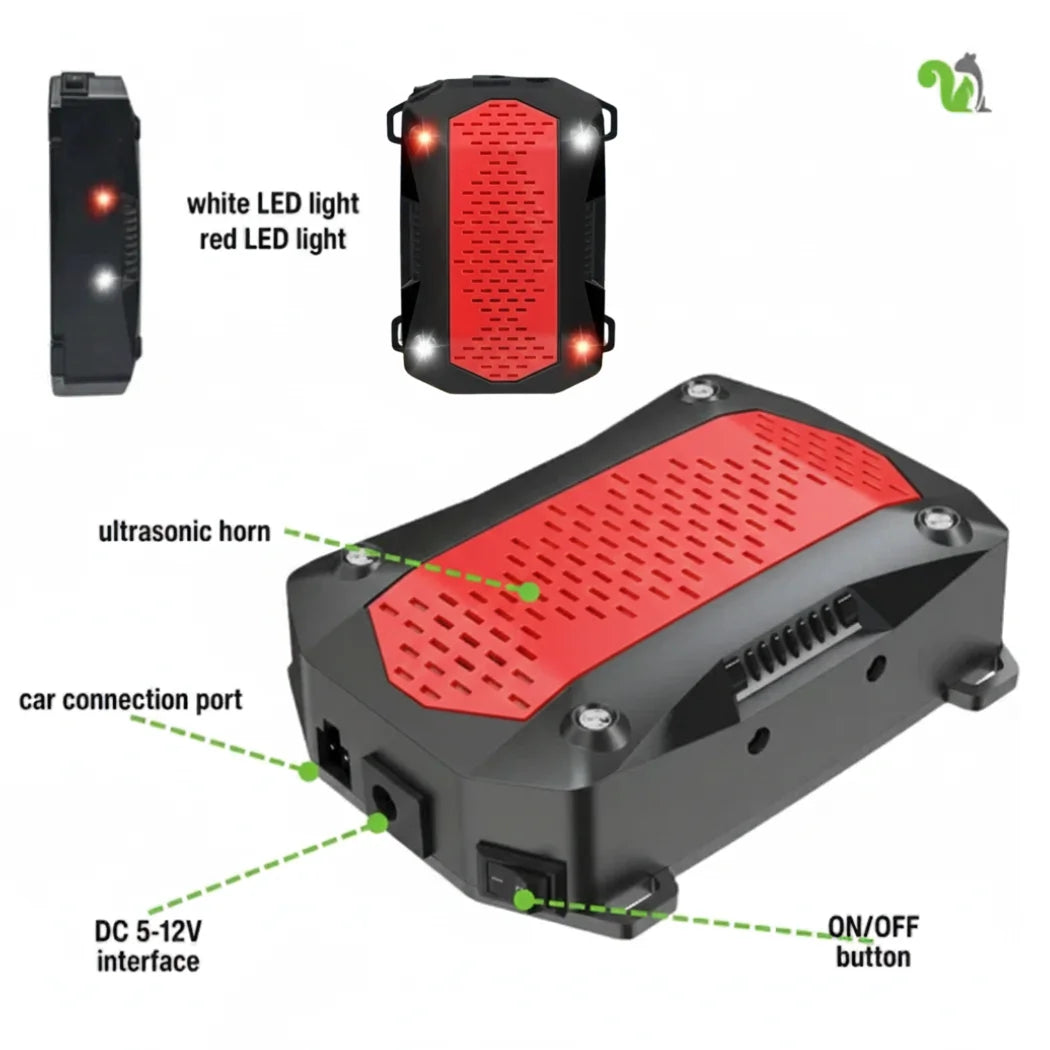The Squirrel Vehicle Pro uses ultrasonic sound waves combined with flashing strobe lights to deter squirrels and other rodents. The sound is annoying to animals but silent to humans, while the lights provide an additional layer of protection.
